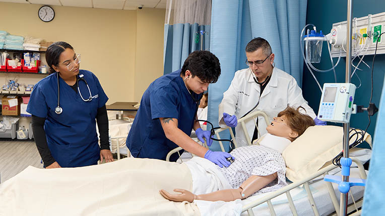 MCC students and instructor work with “Noelle”, one of the high-fidelity advanced training manikins in the MCC LPN SimLab.