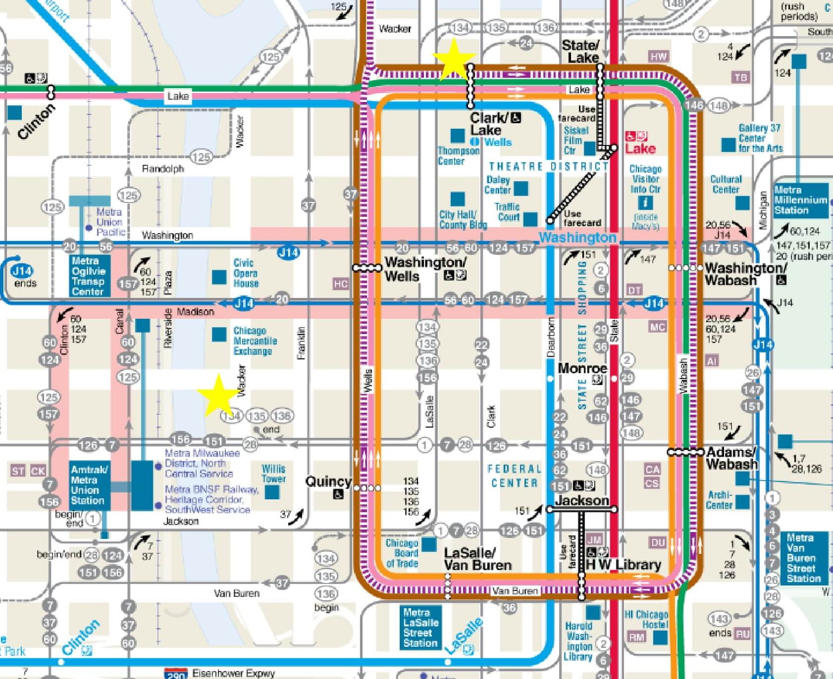 MCC’s downtown campuses are easily accessible by nearby CTA bus lines including 1, 7, 19, 20, 28, 37, 56, 60, 121, 124, 125, 126, 130, 132, 134, 135, 136, 151, 156, 157. The gold stars on the map below (an interactive version can be found here) indicate our two campus locations in the metro area.